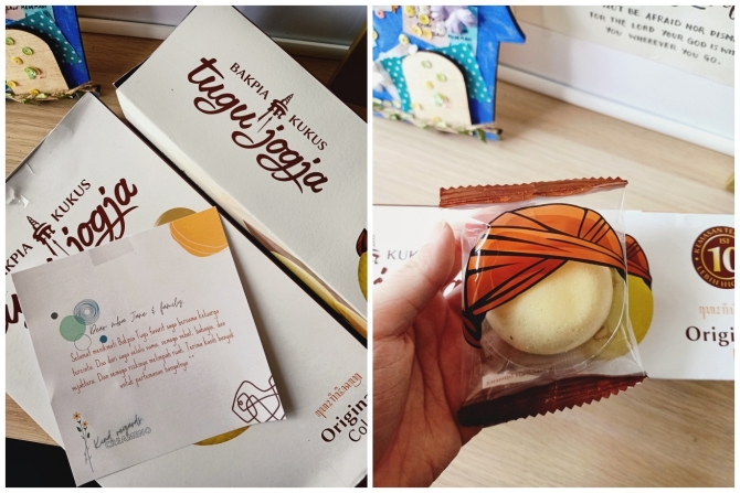 Seperti yang sudah diceritakan oleh teman-teman, aku pun mendapat kejutan yang sama dari Mba Eno dengan paket Bakpia Tugu! Bakpia ini nggak bertahan lama di rumah, karena dalam sekejap ludes saking enaknya. Josh suka sekali dengan bakpia ini. Sebelum dimakan, dia pasti menatap bungkusannya lama kemudian berujar, "Ihh, ini lucu banget kuenya, Ma. Gemes!" 🤣 Tapi memang packagingnya imut sekali, sih. Sempat nggak tega makannya walau habis itu kalap juga 😂