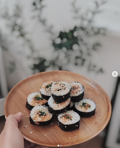 Kimbab ditaruh di atas piring kayu gini beda banget kan feel-nya